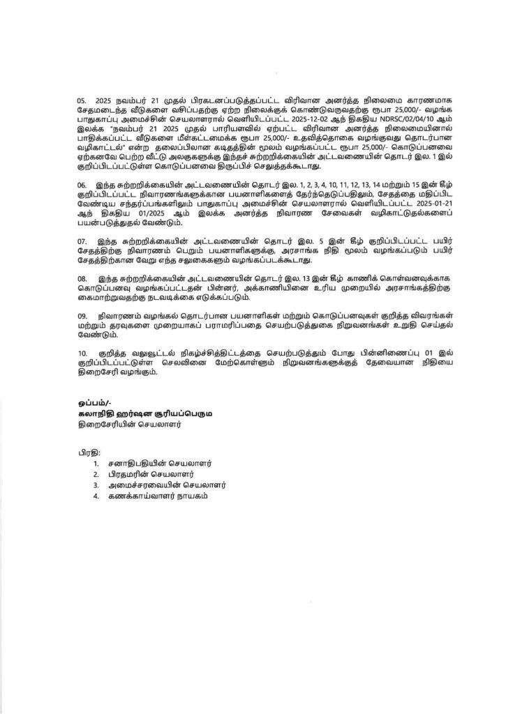 திடீர் பேரிடர் நிலைமை காரணமாகப் பாதிக்கப்பட்டுள்ள மற்றும் சீர்குலைந்துள்ள மக்களின் வாழ்க்கையை மீட்டெடுப்பதற்காக, விரைவான நிவாரணத்தை வழங்குவதை நோக்கமாகக் கொண்டு இந்தச் சுற்றறிக்கை வெளியிடப்பட்டுள்ளது.