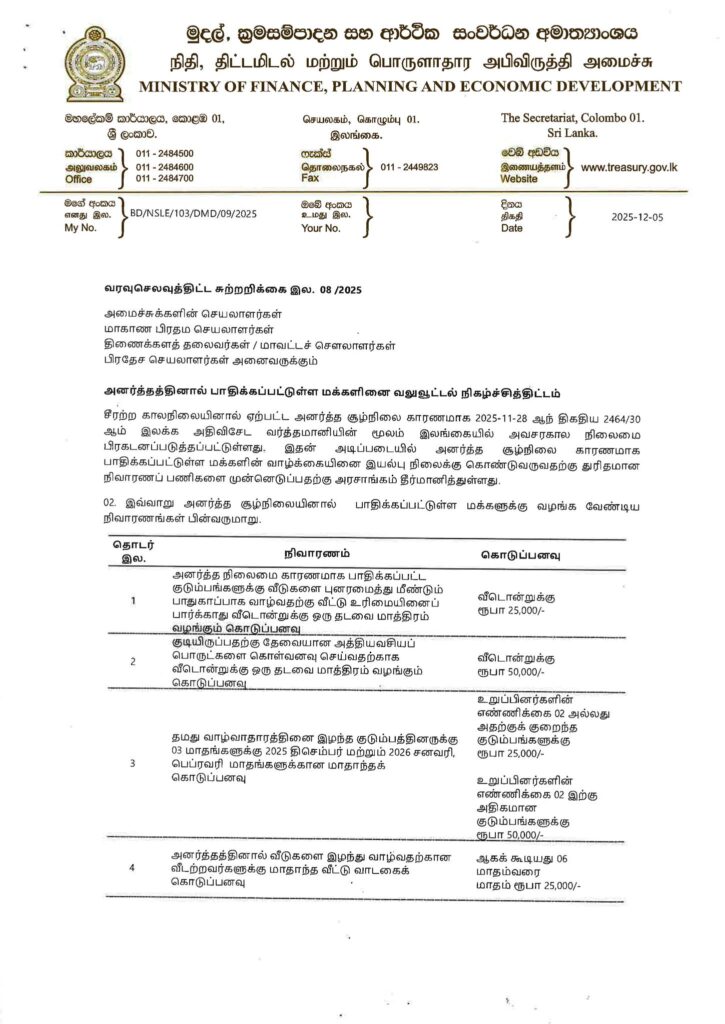 இதனையடுத்து நிவாரணம் தொடர்பான விசேட சுற்றறிக்கை இன்று (05) இரவு வெளியிடப்பட்டுள்ளது.