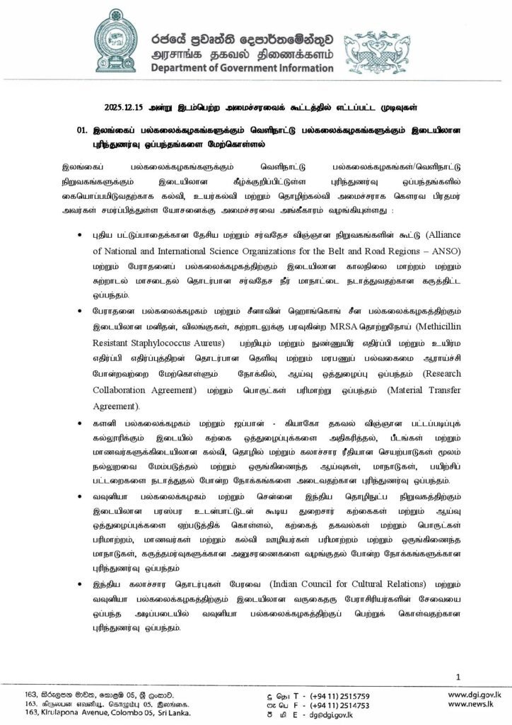 இலங்கைப் பல்கலைக்கழகங்களுக்கும் வெளிநாட்டுப் பல்கலைக்கழகங்களுக்கும் இடையிலான புரிந்துணர்வு ஒப்பந்தங்களில் கையொப்பமிடுவதற்கு கல்வி, உயர் கல்வி, தொழில்கல்வி அமைச்சரான பிரதமர் சமர்ப்பித்த யோசனைக்கு அமைச்சரவை அங்கீகாரம் வழங்கி இருக்கின்றது.